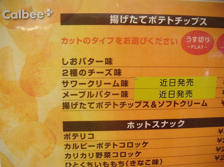 さあ、新千歳空港、国内線のカルビーのお店だよーお姉さんがあげてる!私もそれ食べたい!メニューは・・・やっぱり塩味と思います。私、ポテチは塩味が一番好きです。でも2種のチーズを注文して店内を物色。じゃかりこって味が色々あったんですね?知らなかったな。カルビーのグッズがあってかわいかったですよ。じゃがりこの蓋が、デザインが何種類かあってどれもかわいかったです。5分もしないでポテチできあがりーほんとに今あげてくれたポテチですよーやっと食べれるんですねっじゃじゃーんまー なんかかかってますよー んまほーこのチーズが絶品です!スーパーで売ってるものとは全然違う!ぜったい主任好きですよ、これ嫌いだったら疑う(なにを)しかも思っていたより量があって満足でした。これで280円ですって。まぁ いってもいも揚げただけですからね。しかしこれは食べなきゃだめです。念願のカルビー揚げたての旅は大変満足でした。また食べたいなぁ。東京にも揚げたて食べられるカルビーができたらしいですね。これは是非たくさんの人に食べて、私の感動を知ってほしいと思います。