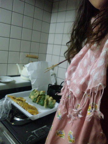 半年ぶりぐらいの天ぷら。コンロ横の窓あけながら。首が寒いからストールまきまき。変態じゃあないよ