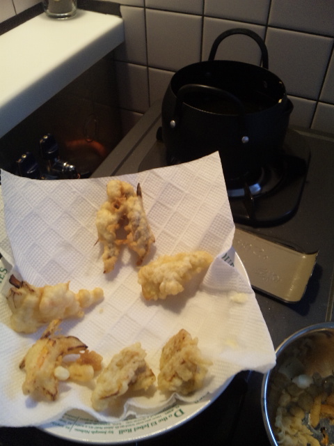 天ぷらに挑戦なんです。おかーさんと一緒にやっていただけで、ひとりでは初めて揚げました。揚げ物が不得意とわかったので、基本に忠実にやってみました。このための今日。すごくさくっとしておいしいのですが、時間が経ったらわからないのでしばし放置。でも、夕食は天ぷらで決まりです☆毎日料理の本開いたり調べたり、ぱぱっとうまくなる魔法でもないのかしら