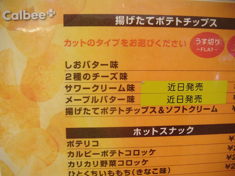 さあ、新千歳空港、国内線のカルビーのお店だよーお姉さんがあげてる!私もそれ食べたい!メニューは・・・やっぱり塩味と思います。私、ポテチは塩味が一番好きです。でも2種のチーズを注文して店内を物色。じゃかりこって味が色々あったんですね?知らなかったな。カルビーのグッズがあってかわいかったですよ。じゃがりこの蓋が、デザインが何種類かあってどれもかわいかったです。5分もしないでポテチできあがりーほんとに今あげてくれたポテチですよーやっと食べれるんですねっじゃじゃーんまー なんかかかってますよー んまほーこのチーズが絶品です!スーパーで売ってるものとは全然違う!ぜったい主任好きですよ、これ嫌いだったら疑う(なにを)しかも思っていたより量があって満足でした。これで280円ですって。まぁ いってもいも揚げただけですからね。しかしこれは食べなきゃだめです。念願のカルビー揚げたての旅は大変満足でした。また食べたいなぁ。東京にも揚げたて食べられるカルビーができたらしいですね。これは是非たくさんの人に食べて、私の感動を知ってほしいと思います。