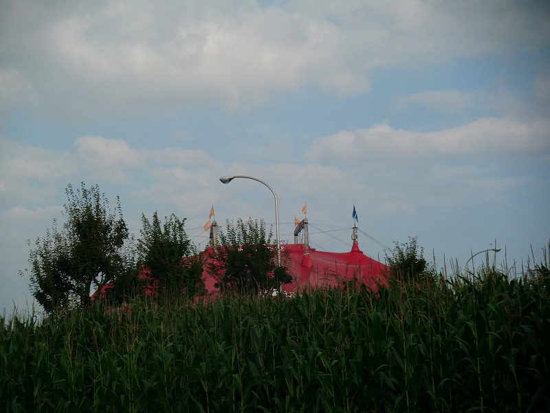 どーん近付いてみると・・・イメージ通りのサーカスですーすごいですね。でも当日では混んでて、優先権をいただいたので、入場券も買っちゃって次の休みの時に行こうと思っていました。さきほど調べてみるとなんと、行こうと思った木曜日は休演日!さーって、どーしよっかなーサーカスなんて、一生に一度、見れるか見れないかじゃないかと思うんですけど。見てみたいな。これは札幌ドームです。昨日はサマーフェスタ。普段はないのですが、このサマーフェスタの3日間だけ出店がでます。よさこいでも使われていた、巨大移動スクリーンが外に設置されて、テーブルが用意されていました。もちろん足りなくて、コンクリートに座り込んで応援です。でも、もう移動するのでよかったら座って下さいって声かけてもらえてテーブルと椅子でゆったりさせてもらいました。そのあと、親より少し上のご夫婦が、私たちのテーブルの横で座り込んで応援するから譲るほかないなぁって思いながらお譲りしましたよwあったかかったから、コンクリートに座っていても苦じゃない。ビール飲んで、ホルモン食べてザンギ食べて焼き鳥食べて、優雅なひと時。席がなくても、ドームの中に入らなくても怒らない。ありがとう