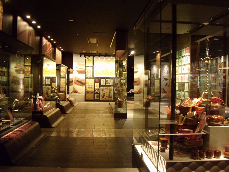 ロイズのおみやげコーナーの外にはなにやらいい雰囲気の廊下がありました。そこは世界中のチョコレートの缶や包み紙が展示されていました。チョコレートを作るときに使われた道具や、昔のチョコの作りの作り方などの歴史みたいなものも知ることができます。今はなんでも機械ですが、作る道具をつくるところからのスタートです。当たり前のことだけど、へーこんなの使って作ったのーって思えます。包み紙なんて、外国のは外国語が書かれてあるだけでなんかかっこいい。どうやって集めたのかっていう古いものも、日本のものもあり、懐かしさ満載。見るものたくさんのロイズのチョコレート工場でした。記念写真。なんか、歩くとそこに波紋が広がるハイテクなチョコレートの滝不思議映像