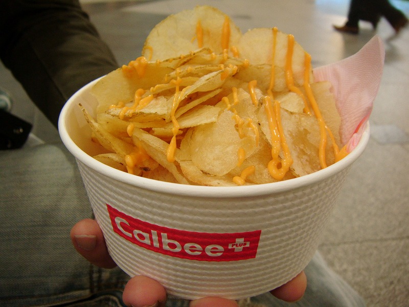 さあ、新千歳空港、国内線のカルビーのお店だよーお姉さんがあげてる!私もそれ食べたい!メニューは・・・やっぱり塩味と思います。私、ポテチは塩味が一番好きです。でも2種のチーズを注文して店内を物色。じゃかりこって味が色々あったんですね?知らなかったな。カルビーのグッズがあってかわいかったですよ。じゃがりこの蓋が、デザインが何種類かあってどれもかわいかったです。5分もしないでポテチできあがりーほんとに今あげてくれたポテチですよーやっと食べれるんですねっじゃじゃーんまー なんかかかってますよー んまほーこのチーズが絶品です!スーパーで売ってるものとは全然違う!ぜったい主任好きですよ、これ嫌いだったら疑う(なにを)しかも思っていたより量があって満足でした。これで280円ですって。まぁ いってもいも揚げただけですからね。しかしこれは食べなきゃだめです。念願のカルビー揚げたての旅は大変満足でした。また食べたいなぁ。東京にも揚げたて食べられるカルビーができたらしいですね。これは是非たくさんの人に食べて、私の感動を知ってほしいと思います。